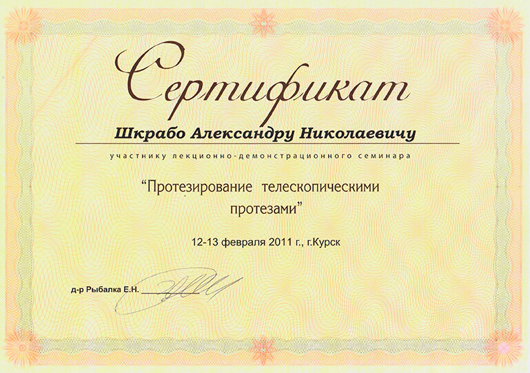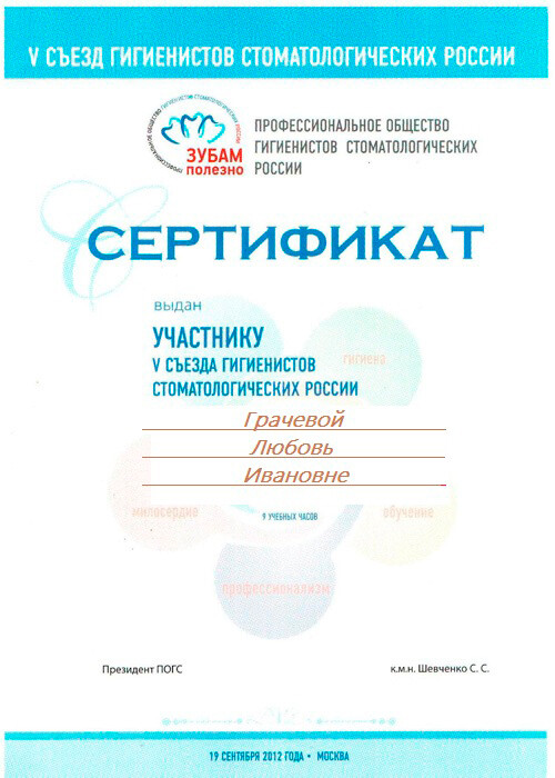 Каждые пять лет сдает квалификационный экзамен в ГБОУ ВПО "Курский государственный медицинский университет" Министерства здравоохранения Российской Федерации с присвоением квалификации "Стоматология терапевтическая".